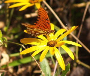 Along with “harvesting” Harvey’s free food, I’m glad I left some of the lantanas for the butterflies dashing about last warm weekend, finding a flower here and there. This Gulf fritillary also spent some time on the grass, doing what I don’t know, but he was very enthusiastic about it.