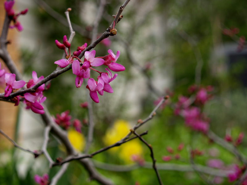 At the end of that bed at the front house side, the Mexican redbud (Cercis canadensis var. mexicana) is spurting, with Gigantic Star narcissus beyond.