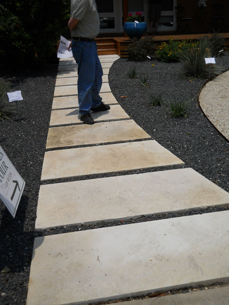 Even though most of my plants will make it through the drought, I’ve got a lot of planning and updating to do. Translation: WORK! One thing is to create larger areas of hardscape, especially pathways. I’ve been analyzing every option “under the sun,” dare I say? On the Windsor Park Garden Tour in May, I took a few pictures of some ideas.