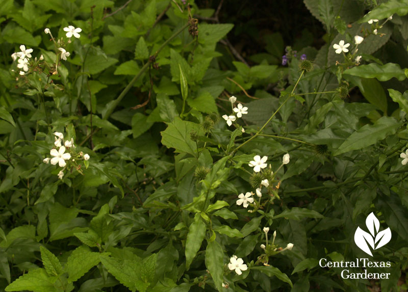 Native plumbago (Plumbago scandens) is less aggressive but just as eager to perform, even in spots that get shade a lot of the day.