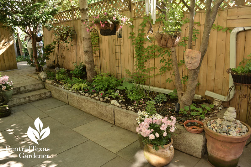 In the Forest Hill neighborhood, this contemporary small space patio goes for soothing, low-maintenance that handles what I call “psycho lighting.” Even in early morning, you can see what I mean: sun and shade that most likely swaps positions later in the day.