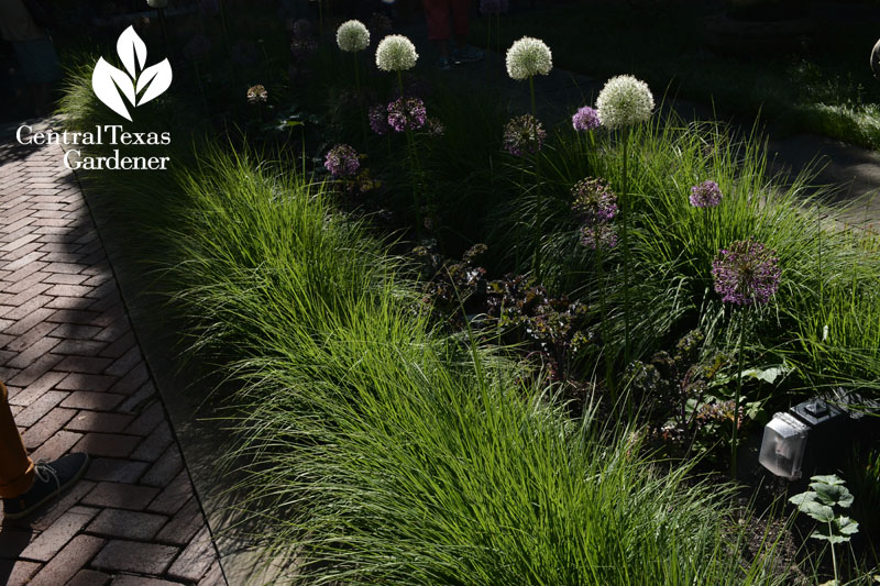 Pennsylvania sedge (Carex pensylvanica) paired with alliums line one narrow bed, a combination I’m going to try with my Texas sedge!