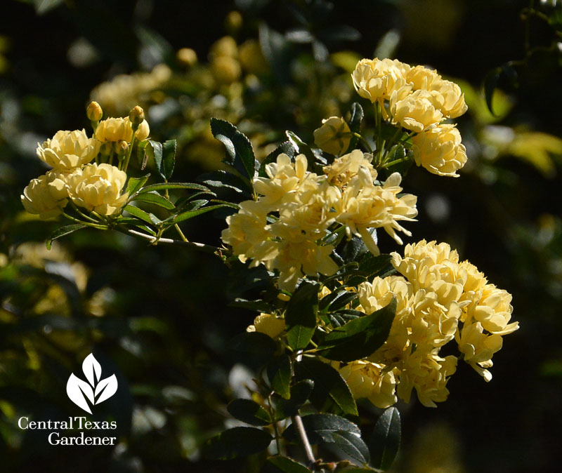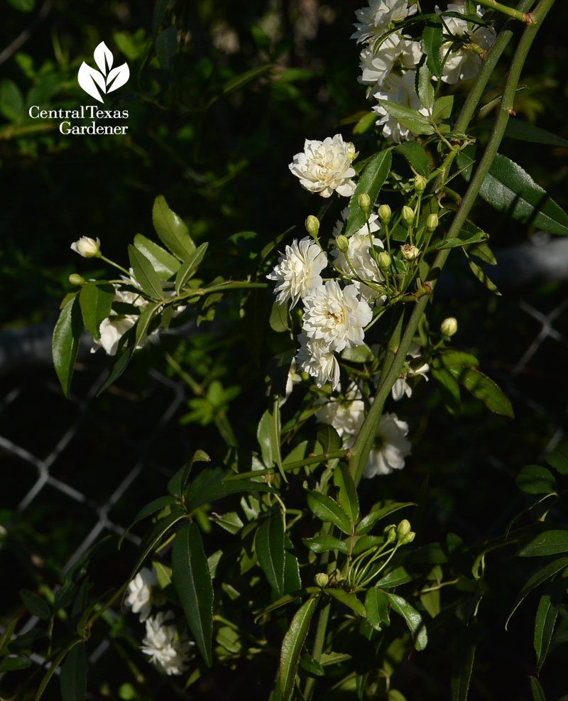 Way back when, I bought a white Lady Banks rose at the Antique Rose Emporium. Wow, I never knew such a thing existed! I plopped it into a blank back corner to shield the fence and quickly swooned over its fragrant clusters.