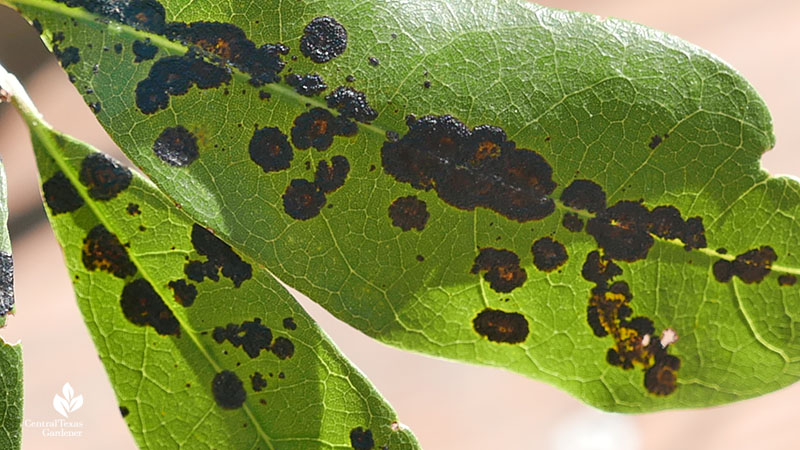 Something else that also gets passed along: fungal disease, like tar spot on this live oak. To me, it looks rather like sooty mold. A quick way to tell the difference, Daphne tells is, is that we can rub off sooty mold, a fungal growth on insect secretions.
