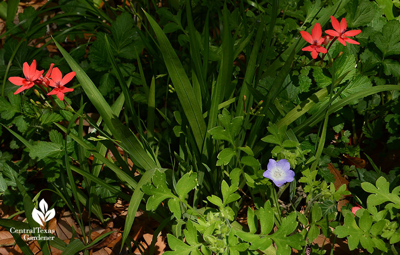 Paired with native Texas baby blue eyes, a self-seeding annual, they team up to bring on the bees in part shade/some sun borders. Plant Freesia’s corms and seed baby blue eyes in October – November.