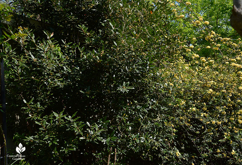 Soon after blooming, cut back stems to shape and so that they don’t end up sky high, like mine—where a native crossvine looking for sunlight is rambling up, too, heralding returning hummingbirds.