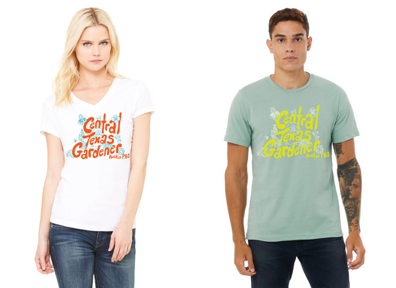 woman wearing white T-shirt orange letters Central Texas Gardener and teal flower designs; man wearing sage green T-shirt with yellow letters and white flower designs