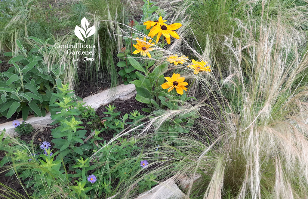 So, what IS the difference between native and adapted plants? Daphne explains: “Native plants are known to grow naturally in a certain region, and so they should do well when planted in landscapes in that region. And adaptive plants are native to regions with a similar climate so they’ve been shown to do well in an area even though they aren’t found in nature there.” (This grouping in James Barela and Ray Delgadillo’s garden includes native aster, adapted Mexican feather grass and Jerusalem sage, and a rudbeckia cultivar.)