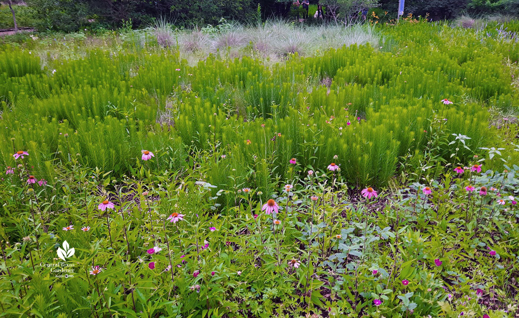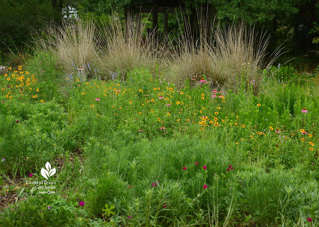 Here’s what it looked like in May 2023: blooming winecup and coneflower mingled with fall-blooming liatris and prairie goldenrod. Big muhly (Lindheimer muhly) flaunts new growth beyond.