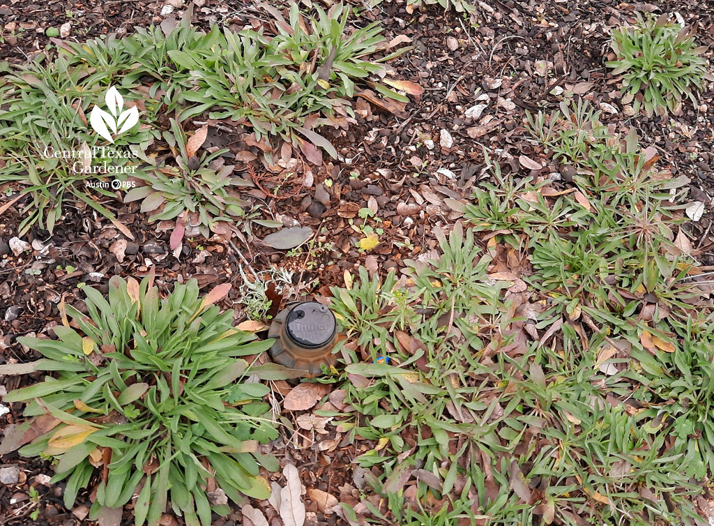 In the front section of the Hill Country Meadow, she’s already cut back browned stalks on perennials like coneflower, winecup, and this prairie goldenrod to show off new growth. Cleaning up also brings in more light for bluebonnet rosettes and upcoming partridge peas.