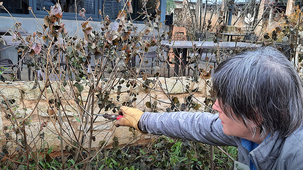 I’m a fan of winter’s richly-toned hues, their quiet palette sandwiched between fall’s leaf-peeping excitement and spring’s sensations. At the same time, I know that post-freeze pruning is on our minds, so Ed Fuentes, Joe Rocha and I headed to the Lady Bird Johnson Wildflower Center for “why and how” with horticulturist Leslie Uppinghouse.